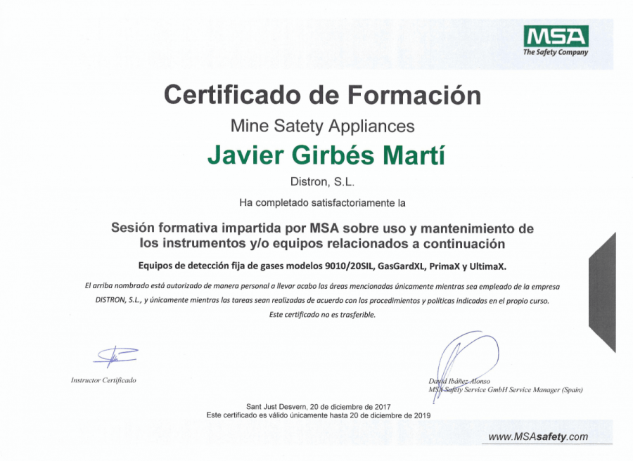 Distron, en su constante afán de dar el mejor servicio, ha obtenido recientemente la certificación de MSA (the Safety Company) para poder ofrecerles el mantenimiento, puesta en marcha, formación, calibración, reparación e instalación de su instrumentación de detección fija de gas y de llama.